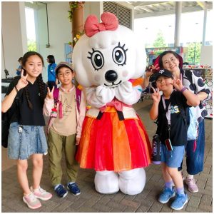 よみうりランドに入場すると、キャラクターのラッキーがいたので、みんなで記念撮影