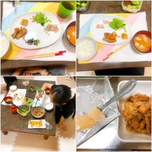 メニューは、豚肉生姜焼き、シラス入り卵焼き、カービィマカロニサラダ、レタスとカニカマのサラダ、ブロッコリー、