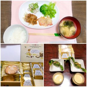 おやつは、なめらかプリン、Aちゃんのおばあさまから頂いた笹だんご、Nちゃんのパパから頂いたお菓子(塩バターラスクとラングドシャ)