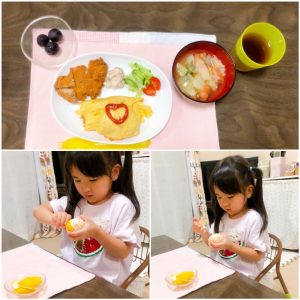 メニューは、オムライス、ポトフ、アジフライ、大根とツナのマヨ和え、レタスときゅうりとミニトマトのサラダ、巨峰、みかん。