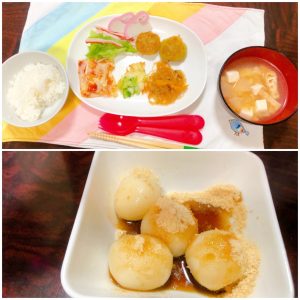 その他のメニューは、チャプチェ、餃子の皮のピザ、ブロッコリーチーズ焼き、さつまいももち、レタスとカニカマのサラダ、