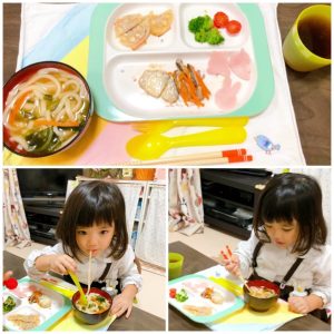 メニューは、わかめうどん、レンコンチーズはさみ焼き、ハム&チーズ、たらときのこのホイル焼き、ブロッコリー、ミニトマト、ゼリー。