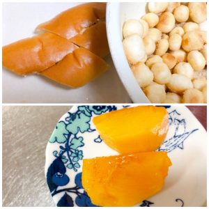 おやつは、ツナドッグ(Yちゃん)、鮭おむすび(Cくん)、お麩のかりんとう、柿