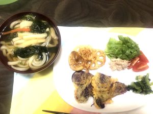 夕食は、わかめうどん、紅芋のチーズガレット、レンコン素揚げ、レタスとツナのサラダ、ミニトマト、りんごとバナナ