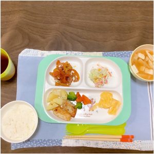 メニューは、白身魚と野菜のソテー、チーズ入り卵焼き、レンコンと人参のきんぴら、コールスロー、油揚げと豆腐のみそ汁、ゼリー。