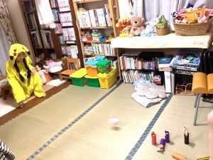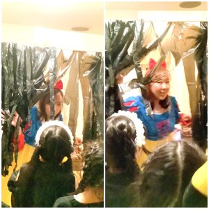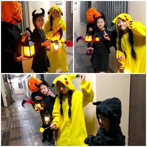 先に来ていた、ピカチュウYちゃんと、かわいいデビルのAちゃん、そしてかぼちゃさん(だれかな?)が、こうもりに仮装したAさんをお出迎え。