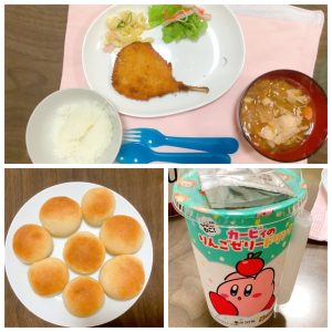 メニューは、具沢山豚汁、アジフライ、マカロニサラダ、レタスとカニカマのサラダ、ごはん、ゼリー