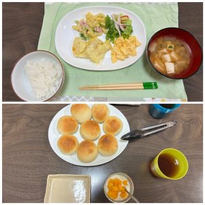 昼食は、じゃがいもチーズ焼き、マカロニサラダ、スクランブルエッグ、レタスとカニカマのサラダ、ごはん、