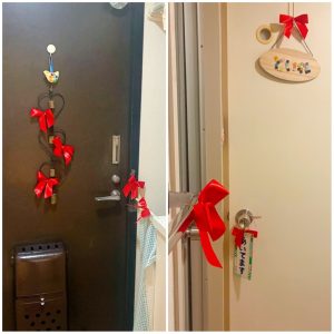 YちゃんとAちゃん、おやつを食べて、真っ赤なリボンをお部屋のあちらこちらにつけていきましたよ。