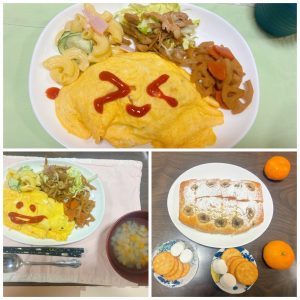 夕食は、オムライス、ごぼうと肉のサラダ仕立て、マカロニサラダ、レンコンと人参のきんぴら、コンソメスープ、りんご。