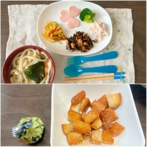 昼食は、わかめうどん、ひじきと大豆の煮物、ハム&チーズ、ツナと大根のマヨ和え、ブロッコリー、ウインナーと野菜のカレー炒め、