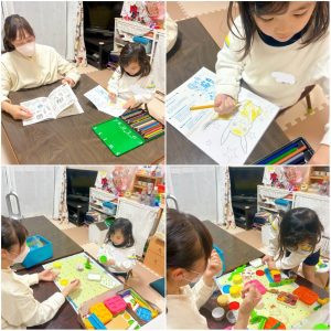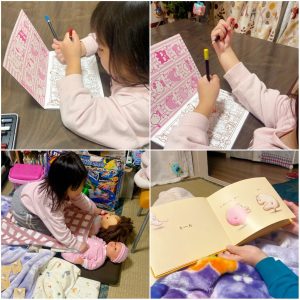 お風呂の後もぬりえ、「あかとあおでむらさき?」「きいろとあかでオレンジ?」って、色を混ぜで描いていましたよ。