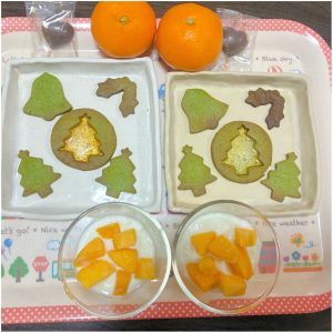 クッキー、マンゴーヨーグルト、みかん、チョコ