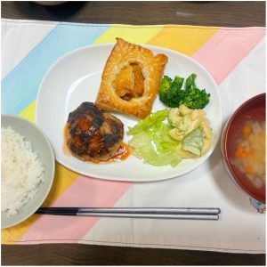 メニューは、ハンバーグ、かぼちゃパイ、ブロッコリー、マカロニサラダ、レタス、ごはん、コンソメスープ、ゼリーでした。