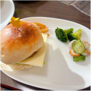 ハンバーグとレタスとチーズとトマトをはさんで、ハンバーガーにして食べました。