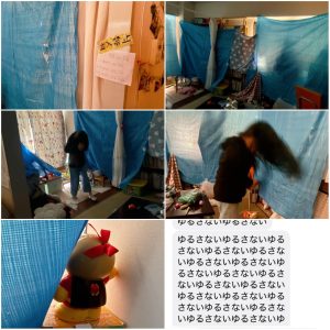 午後は、お化け屋敷ごっこ。2人はかなり本格的なものをやりたいって言って、検索して、音や小道具などいろいろ考えて、準備しましたよ。