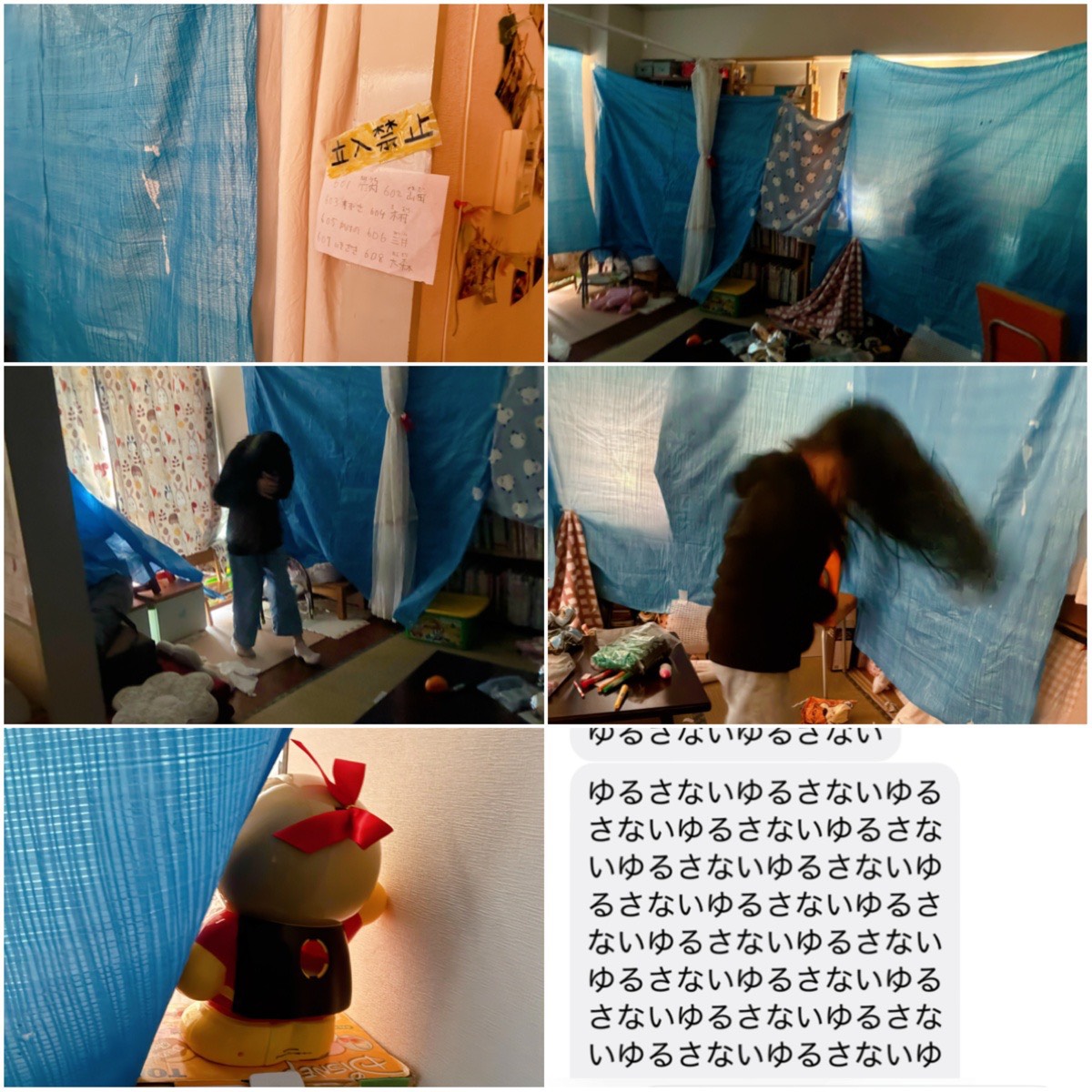 真っ暗な部屋に、ブルーシートの中だけぼんやり灯りが灯っていて、ガサガサって音がしたり、