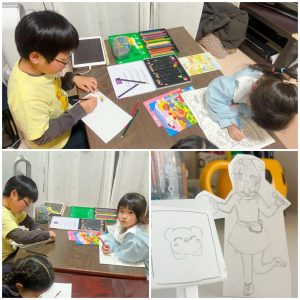 Yちゃんは、塗り絵を、AちゃんとRくんもお絵描きを楽しみました。