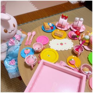 お迎えに来たママに、ケーキやお菓子をたくさん並べたいちごカフェのテーブルをYちゃんがうれしそうに見せて、