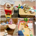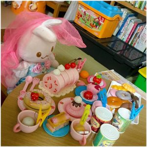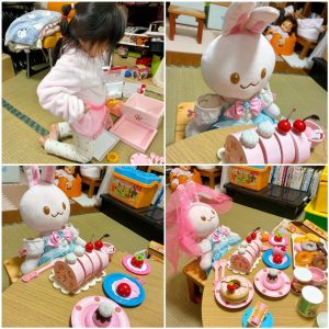 Yちゃん、ピンクのエプロンをつけて、リボンちゃんの前にケーキやお菓子など、おいしいものを次々にテーブルに並べましたよ。