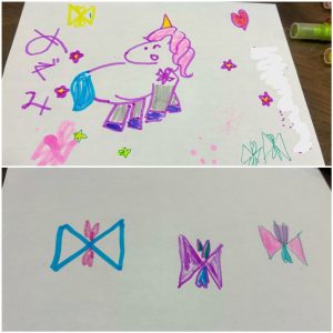 Yちゃんは、かわいいリボンを描いて、めぐさんは、Yちゃんのお洋服についていたユニコーンを描いていたら、