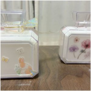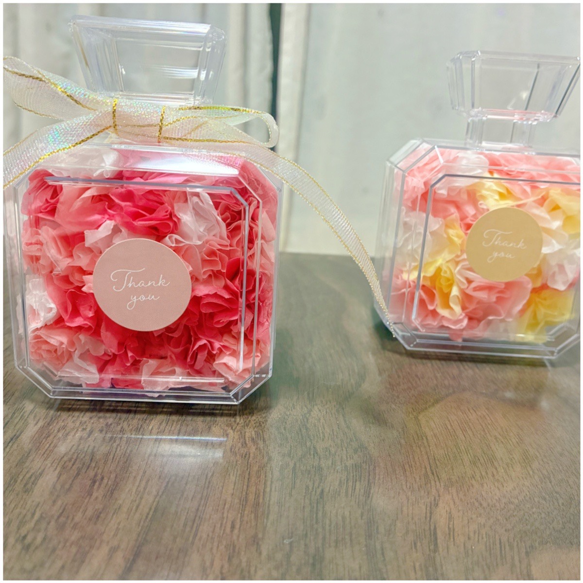材料は、お花紙とふわふわ粘土と香水瓶型のケース、リボンとシール、アロマスプレー。