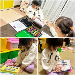 ふみさんんと、塗り絵をしたり、夕食後には、いちごカフェで遊んだり、ピアノ絵本でピアノを弾いたりして遊びました。