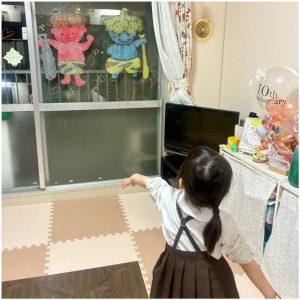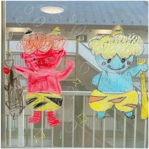 Nちゃんは、入室すると窓に描かれた赤鬼と青鬼を見つけて、ニコニコ!