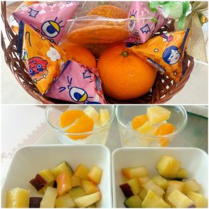 この日のおやつは、さつまいもとリンゴシロップ煮、フルーツ寒天、みかん、塩せんべい、節分チロルチョコ、福豆でした。