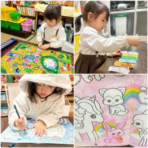 お風呂でゆっくり温まった後は、ぬりえをして過ごしました。