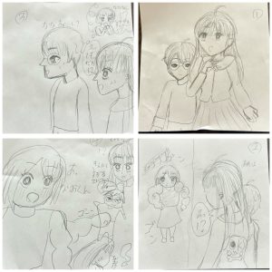 夕食後、2人のAちゃんは、本を作ると言って、ストーリーを考えて絵を描いていました。
