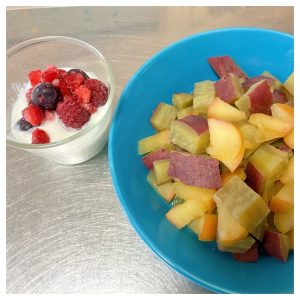 おやつは、さつまいもとリンゴのシロップ煮、ベリーヨーグルト、雑魚せんべい、雪見だいふく