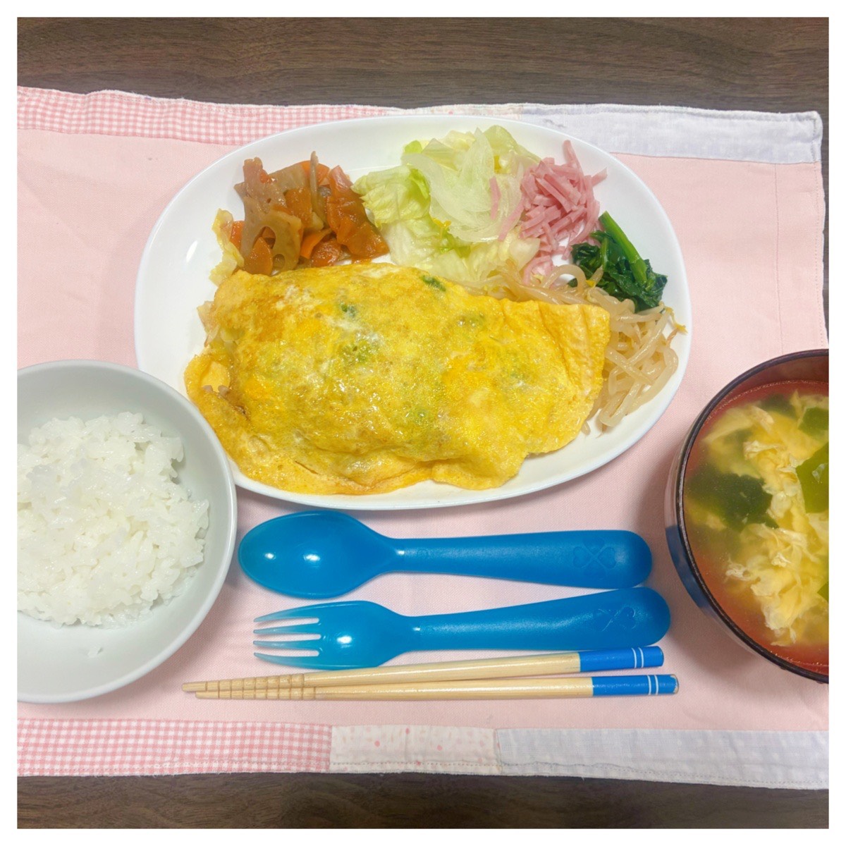 夕食は、白菜と豚肉のとん平焼き、ほうれん草ともやしのナムル、レタスと玉ねぎとハムのサラダ、レンコンと人参のきんぴら、