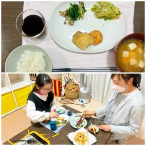 夕食メニューは、さつまいもの天ぷら、ブロッコリーチーズ焼き、ほうれん草としめじの和風ソテー、ごはん、大根と人参と豆腐のみそ汁、